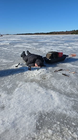 Keli suosi tänään kalastajia,ei liian kylmää. Aurinko olisi tietysti voinut näyttäytyä. Joutsenet sentään tekivät ylilennon,kevät lähestyy. Osa porukasta meni kilpajuoksua "parhaille"paikoille. Voittaja sen sijaan harhautti ja jatkoi matkaansa pidemmälle. Kalat olivat aika tasakokoisia,särkeä oli huonosti liikkeellä. Syönti oli vaihtelevaa,niinkuin aina.