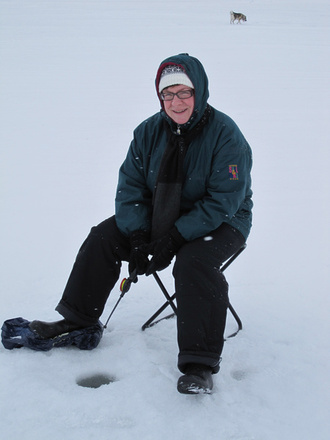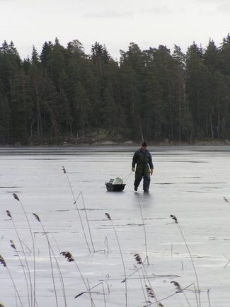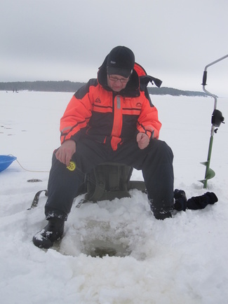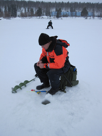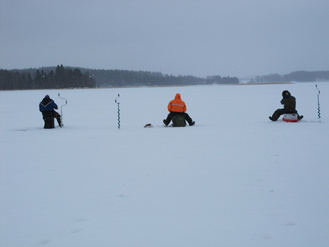 Olo oli huojentunut kun rannalta näkyi mönkijöitä kulkevan jäällä. Porukka hajaantui jäälle päästyään laajalle alalle.Syönti oli heikonlaista,mutta oli sieltä mukavan kokoinen haukikin tarttunut mukaan.