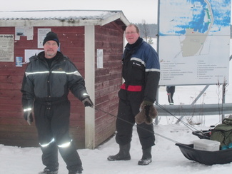 ![]() Taloudenhoitajamme laittamassa siimaa kireälle. | ![]() Pitkänpäivän väsyttämät kalastajat. |